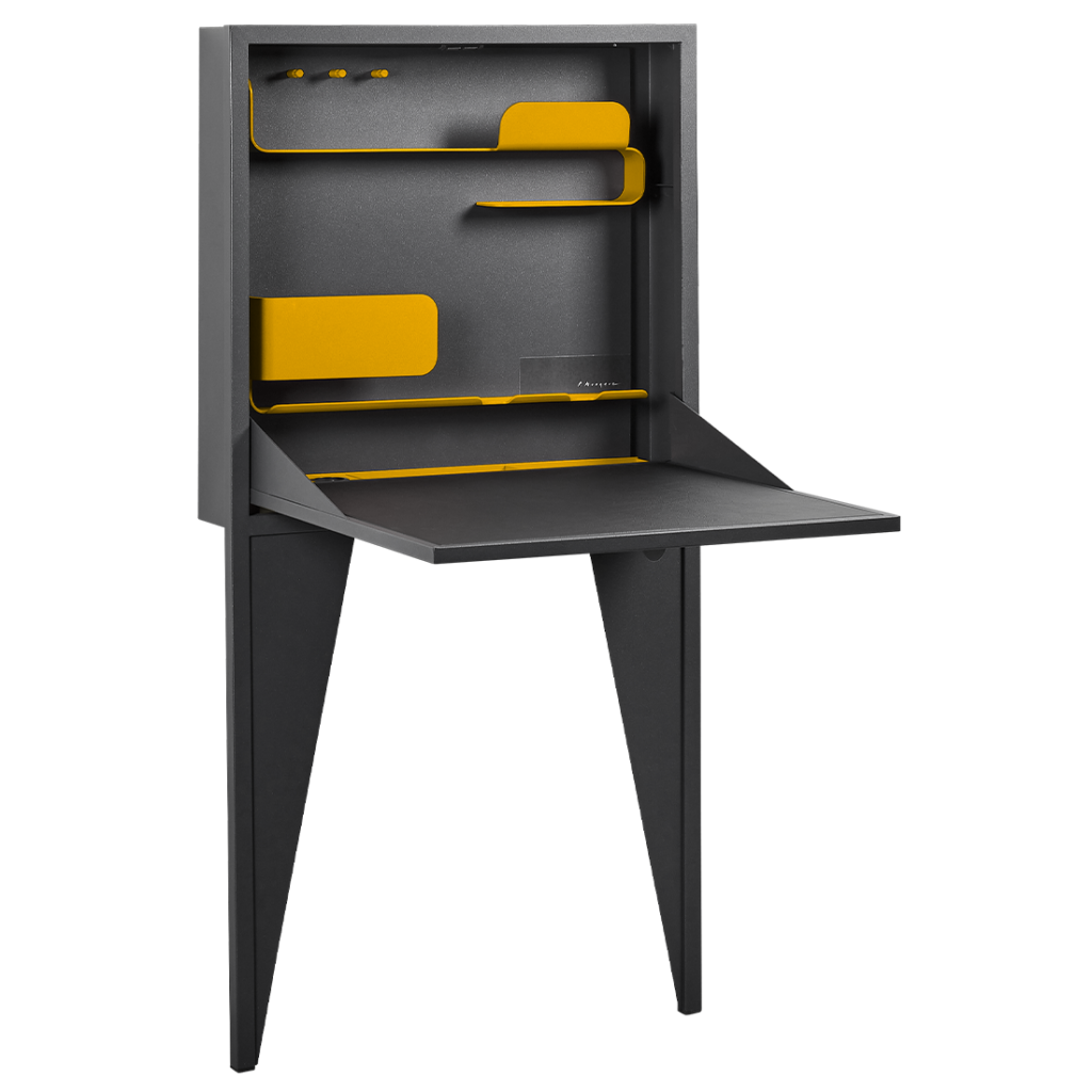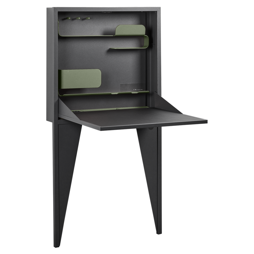 De Fermob Face A Face: Het Face à Face-bureau won zijn ontwerper, Pascal Mourgue, de Grand Prix de la Création-prijs in 1985. Nu heeft Fermob, tot grote vreugde van fans overal ter wereld, dit iconische stuk opnieuw uitgebracht met wat extra, moderne accenten. Face à Face is geïnspireerd op het houten bureau met vakjes voor snuisterijen dat ooit een steunpilaar van elk huis was – en een uitstekende illustratie van Fermob’s traditionele knowhow en expertise op het gebied van metaalbewerking. Het is perfect voor intieme momenten alleen. De opklapbare deur is voorzien van een bureaulegger van imitatieleer, waar u ansichtkaarten kunt schrijven, een notitie aan uw agenda kunt toevoegen of zelfs uw boekhouding kunt doen – en dat allemaal terwijl u naar uw favoriete nummers op uw smartphone luistert terwijl deze wordt opgeladen. De bijgewerkte versie van Face à Face is nu geschikt voor de 21e eeuw, compleet met twee USB-poorten, een stopcontact en slimme opbergvakken die uit het zicht zijn verborgen. Ondertussen hebben de snuisterijschalen hun eigen visuele aantrekkingskracht en zijn ze verkrijgbaar in drie kleuren. Voor welke ga jij: Cactus, Clay Grey of Honey? Maar dat is niet alles. Dit design-geïnspireerde bureau bevat ook een sleutelhanger, tijdschriftenrek, brievenrek, brillenhouder en smartphone- of tablethouder. Maar ondanks al deze functies kan Face à Face nog steeds plat worden opgevouwen, waardoor het minimale ruimte in beslag neemt in uw slaapkamer of woonkamer. De antracietkleurige buitenkant voegt een elegante toets toe aan elk interieur. Dus als Face à Face u aanspreekt, waarom zou u zich dan niet laten verwennen? De beste manier om van de verleiding af te komen is immers door eraan toe te geven!