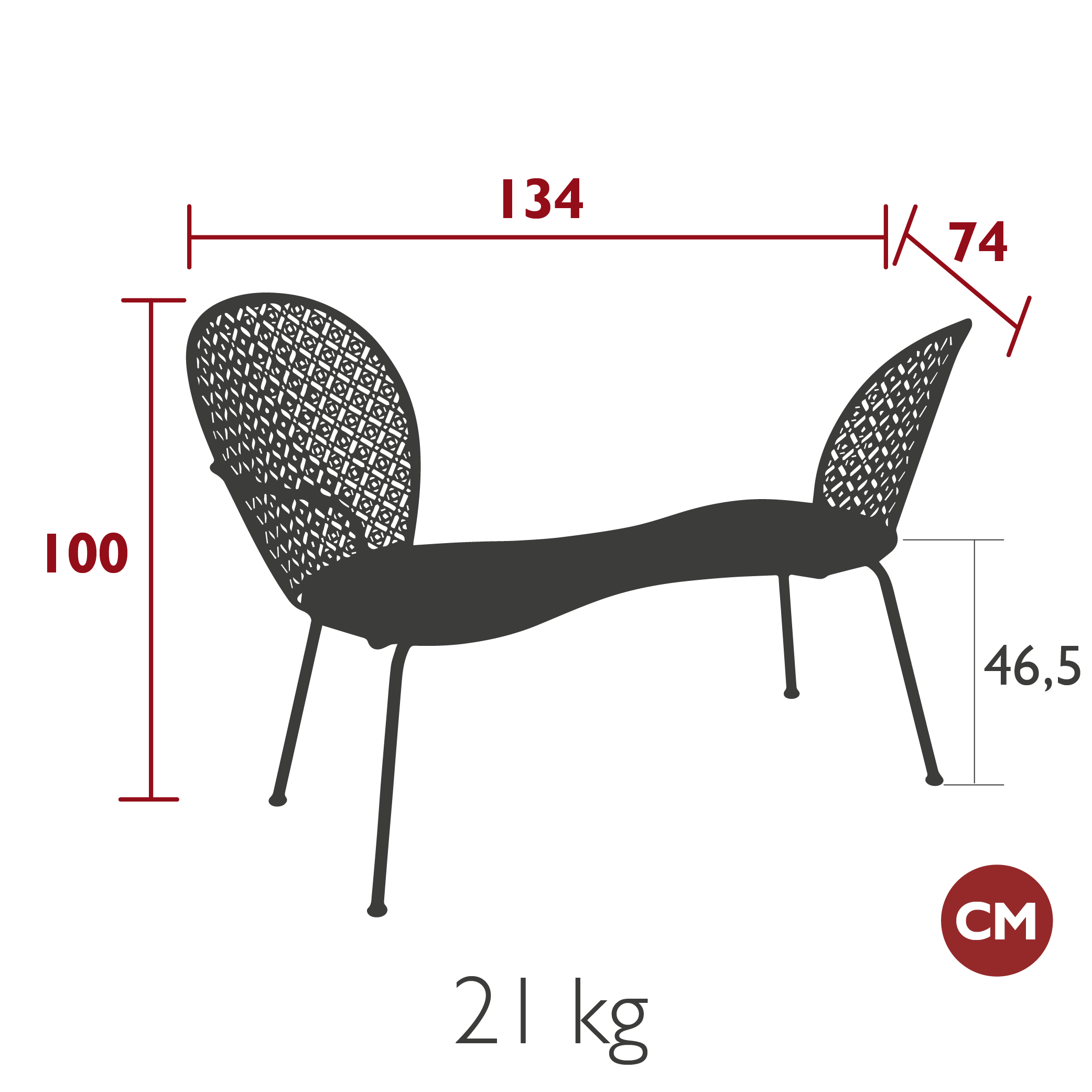 Breedte 134 cm, diepte 74 cm, hoogte 100 cm, zithoogte 46,5 cm, gewicht 21 kg.