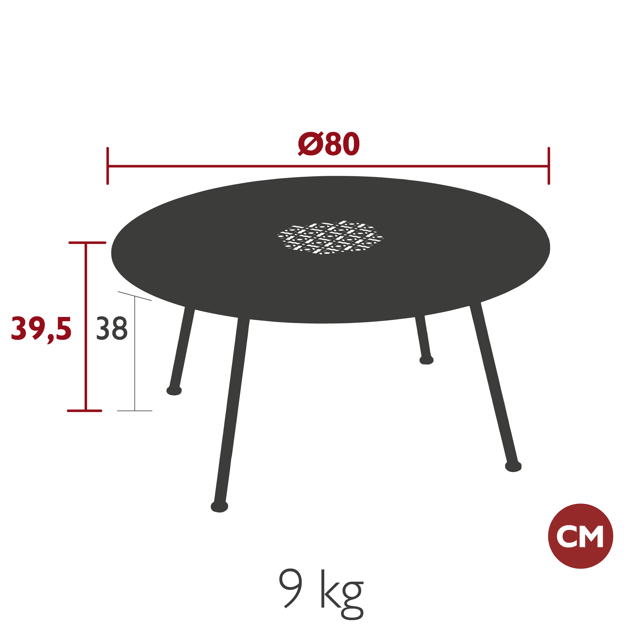 Doorsnede 80cm, hoogte 39,5, gewicht 9 kg, materiaal staal.