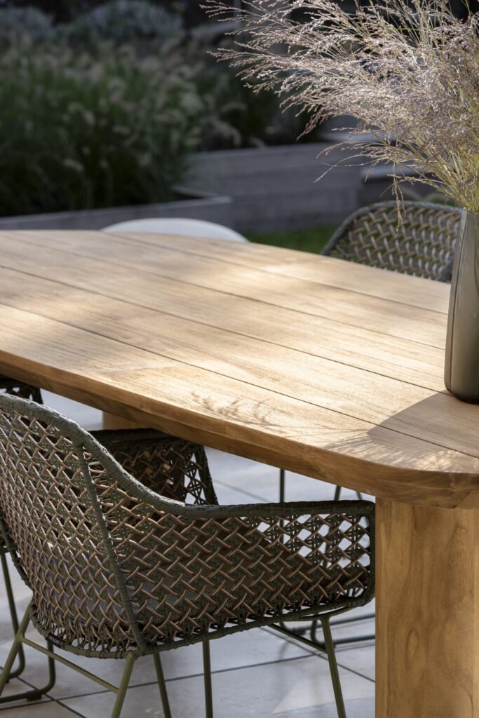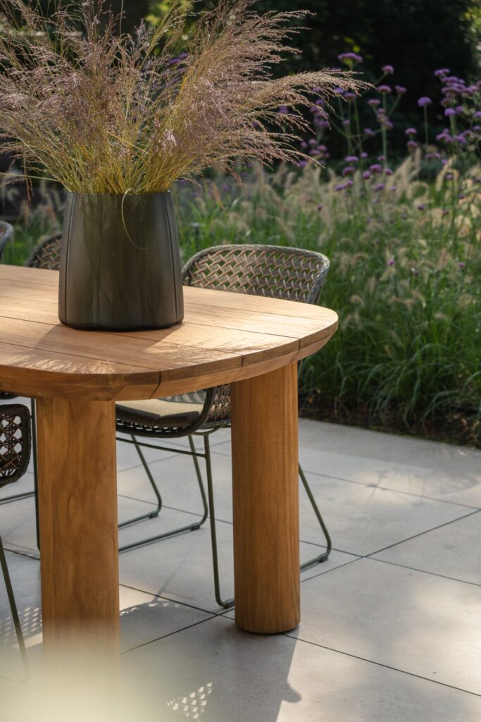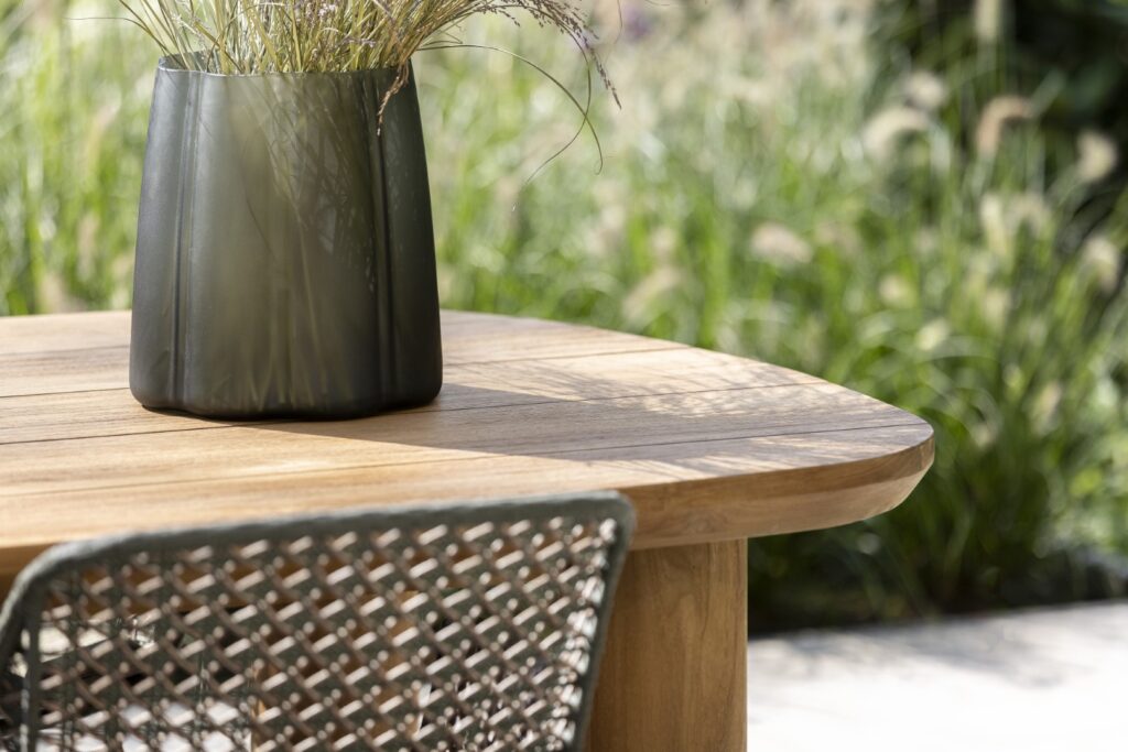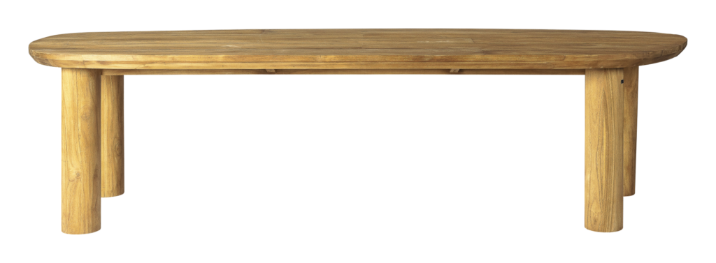 De Tirenna tafel is een echte blikvanger dankzij haar solide, volumineuze poten en royale blad. De licht schuin aflopende randen voegen een subtiel detail toe, wat de tafel een verfijnde en elegante uitstraling geeft. Het unieke, dynamische ontwerp met lange asymmetrische zijdes brengt leven in elke buitenruimte, zonder te overheersen. Het gebruik van teakhout in een neutrale tint en rustige structuur zorgt ervoor dat de tafel naadloos in elke tuinsetting past. De sierlijke rondingen in zowel het blad als de poten creëren een harmonieus geheel, wat de Tirrena tafel niet alleen functioneel, maar ook stijlvol maakt.