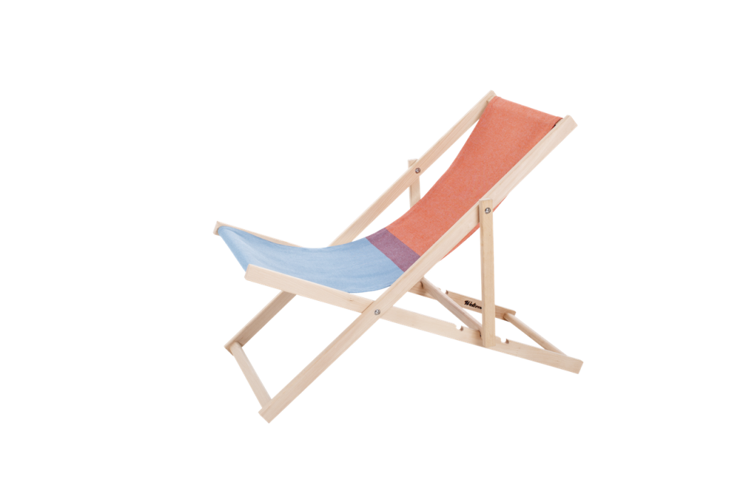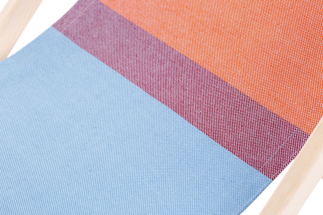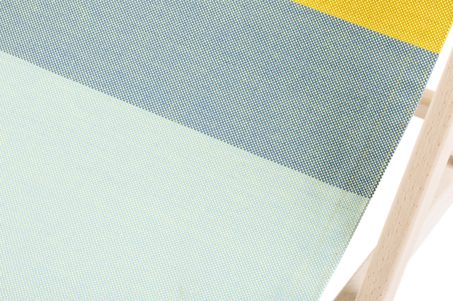 De Beach Chair is gemaakt van Nederlands beukenhout en geweven katoen. De stoel is te verstellen in drie standen, zodat je rechtop kunt zitten om een boek te lezen of achterover kunt relaxen.