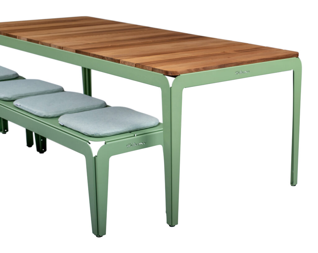 De Bended Table Wood is een uitbreiding van de welbekende Bended Series van ontwerper Jaïr Straschnow. Het tafelblad van Europees essenhout geeft de tafel een warme en verfijnde uitstraling. Het gerecyclede essenhout is thermisch behandeld: het hout is als het ware ‘gebakken’ op hoge temperatuur, waardoor het sterker is en dus zeer geschikt voor buitengebruik. De thermische behandeling geeft het essenhout ook zijn donkere kleur en benadrukt de tekeningen in het hout, waardoor de tafel een nog warmere en natuurlijkere uitstraling krijgt.