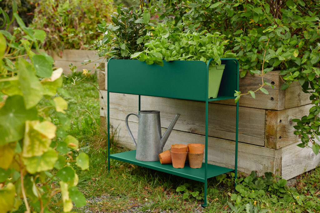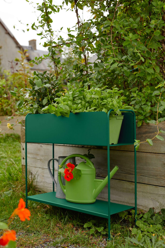 De bovenbak is ideaal voor kruiden, bloemen of kleine planten, terwijl de onderste plank extra ruimte biedt voor potten of accessoires. Dankzij de duurzame Fermob poedercoating is het plantenrek bestand tegen weer en wind en geschikt voor zowel binnen als buiten.